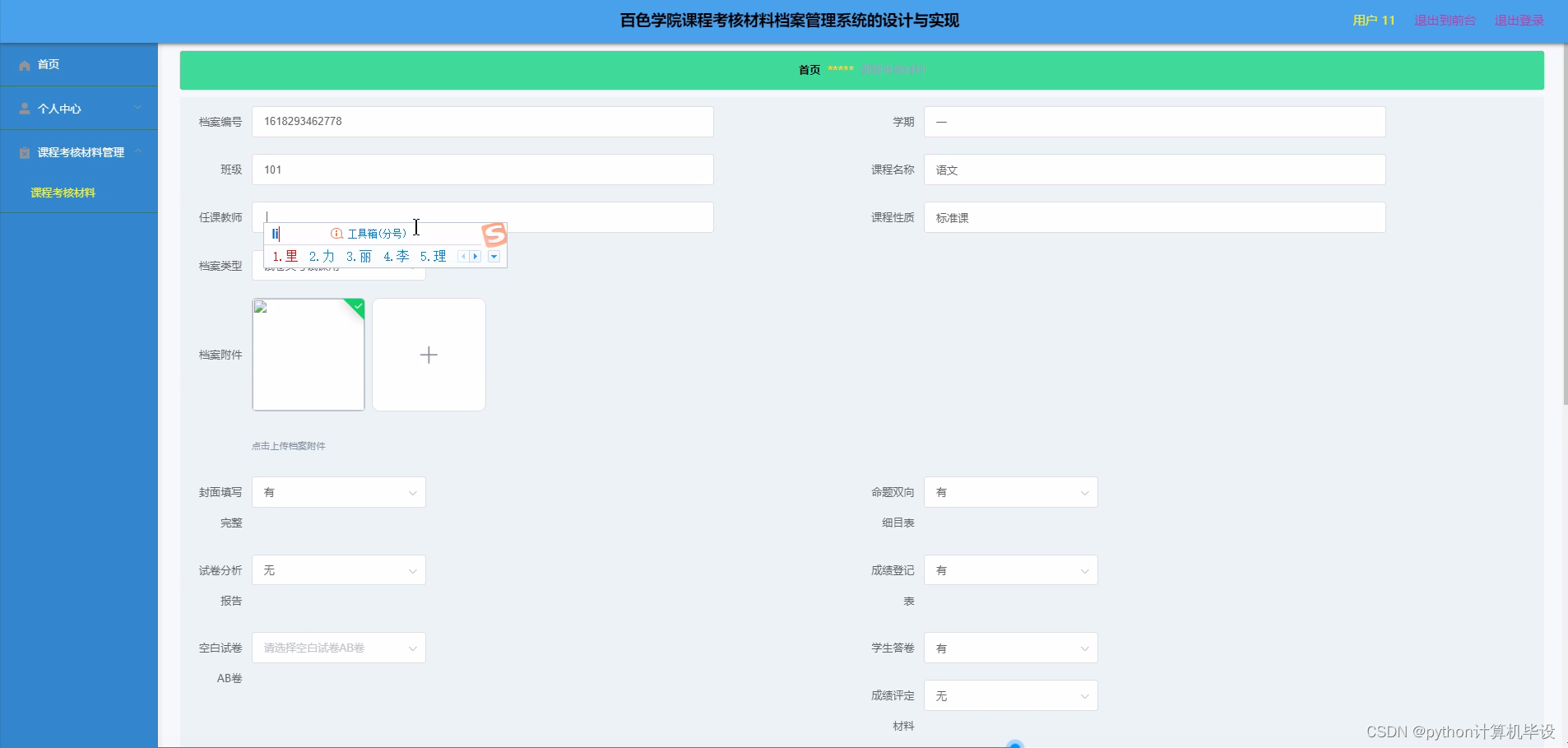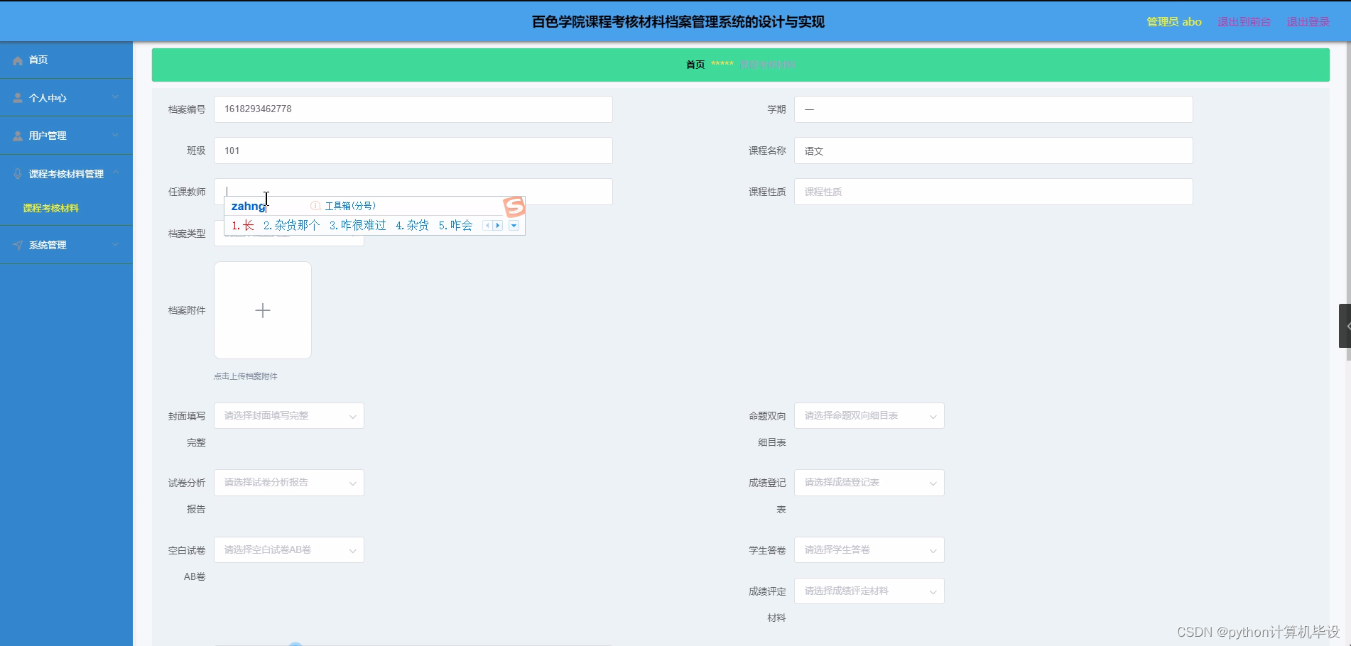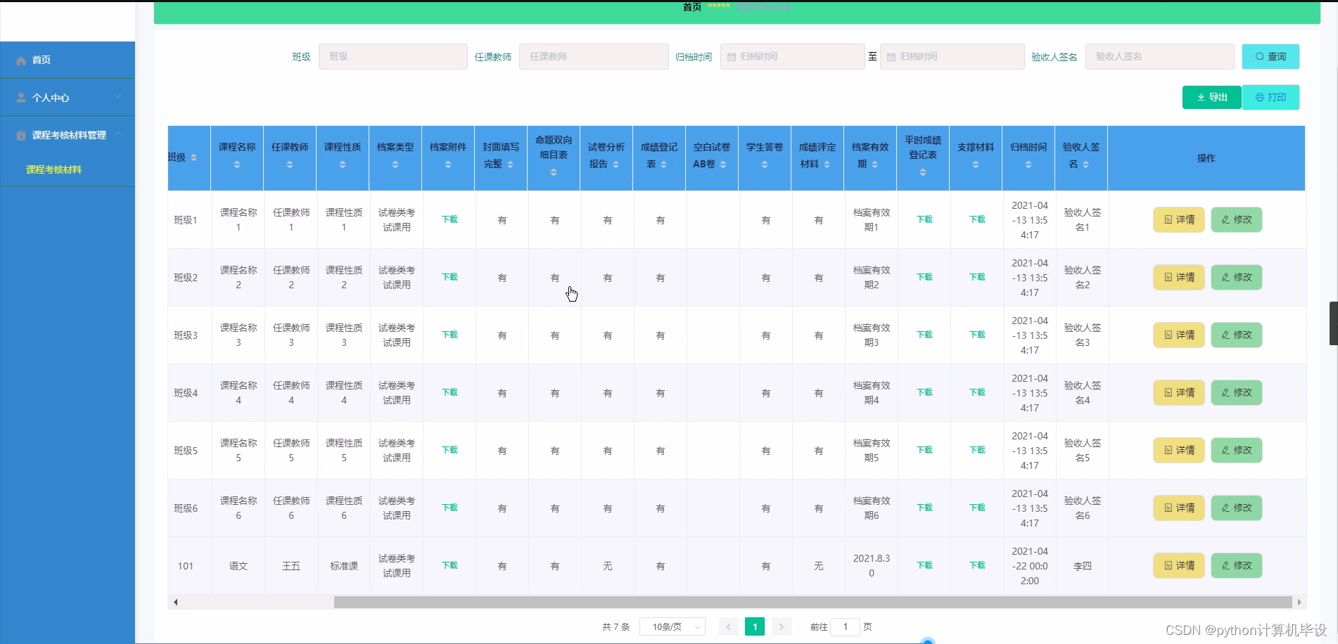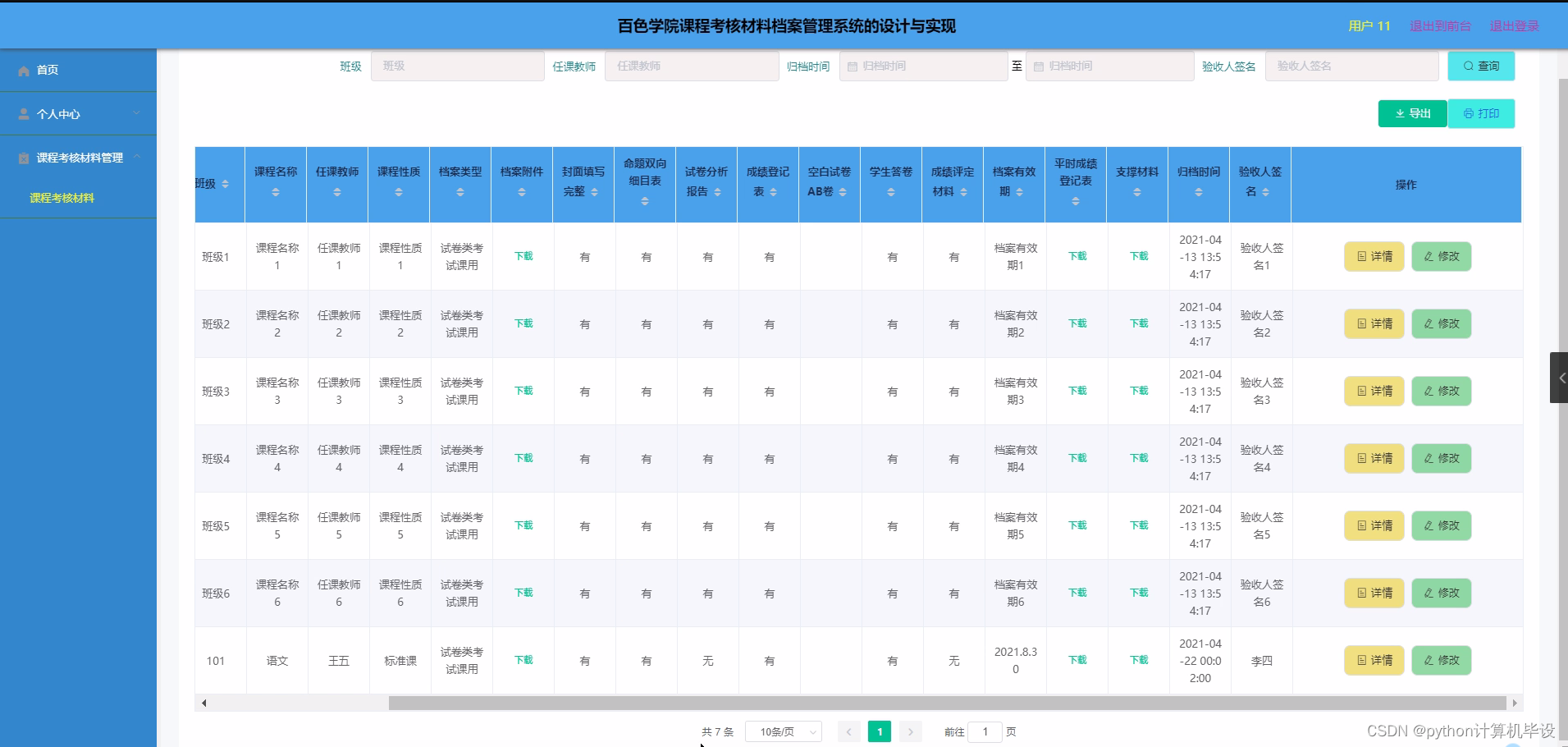 随着信息技术的不断发展,教育行业也在逐步实现信息化管理。课程考核材料档案管理系统作为教育管理的重要组成部分,对于提高教学质量、促进教学改革具有重要意义。百色学院作为一所地方本科院校,拥有丰富的教育资源和多样化的教学体系。然而,传统的课程考核材料档案管理方式已经无法满足现代教育的需求,存在诸多问题,如信息不对称、管理效率低下、资源利用率低等。因此,设计并实现一套适应百色学院实际情况的课程考核材料档案管理系统具有重要的现实意义。