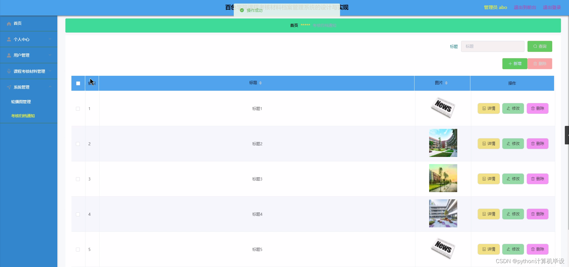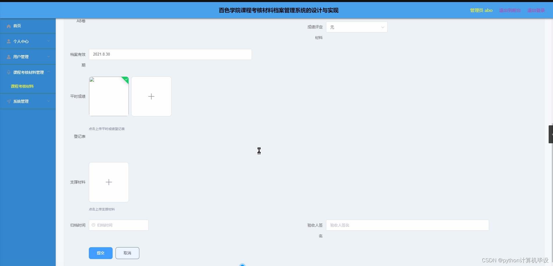 本课题旨在设计并实现一套百色学院课程考核材料档案管理系统,以提高课程考核材料的管理水平和服务质量。通过对现有课程考核材料档案管理方式的分析,找出存在的问题和不足,为系统设计提供依据。结合百色学院的实际情况,采用先进的信息技术手段,设计出一套功能完善、操作简便、安全可靠的课程考核材料档案管理系统。通过系统的实施与运行,验证其可行性和有效性,为百色学院的课程考核材料档案管理工作提供有力支持。