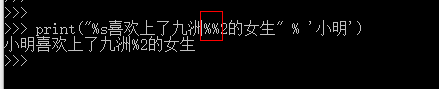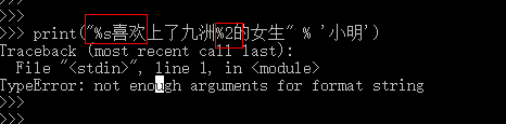 如上图所示,格式化输出的固定格式为 (%sxxx%s*******%d) % (str1,str2,int),在%的左边,占位符有几个,右边需要的变量就要几个。上图%左边有三个占位符,所以%的右边传入了三个参数