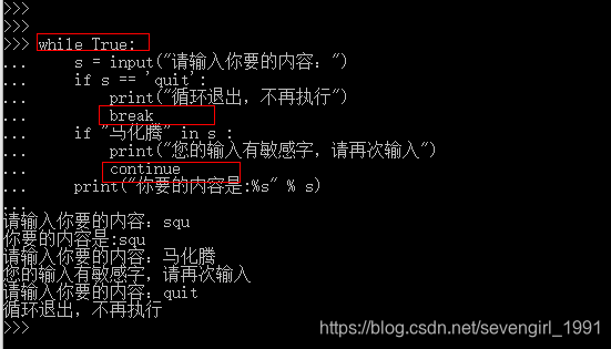 step3:有一个if条件,如果输入的字符串里面包含‘马化腾’,就提示有敏感字,并且退出本次循环,继续执行下一次循环。