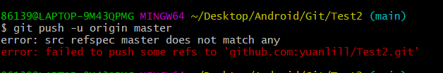 关于error: src refspec master does not match any error: failed to push some refs to ‘github.com:github 关于error: src refspec master does not match anyerror: failed to push some refs to 'github.com:yuanlill/Test2.git’问题问题描述在某次使用Git上传代码到Github时出现错误,提示error: src refspec master does not match anyerror: failed to push some refs to 'github.com:Username/Test.