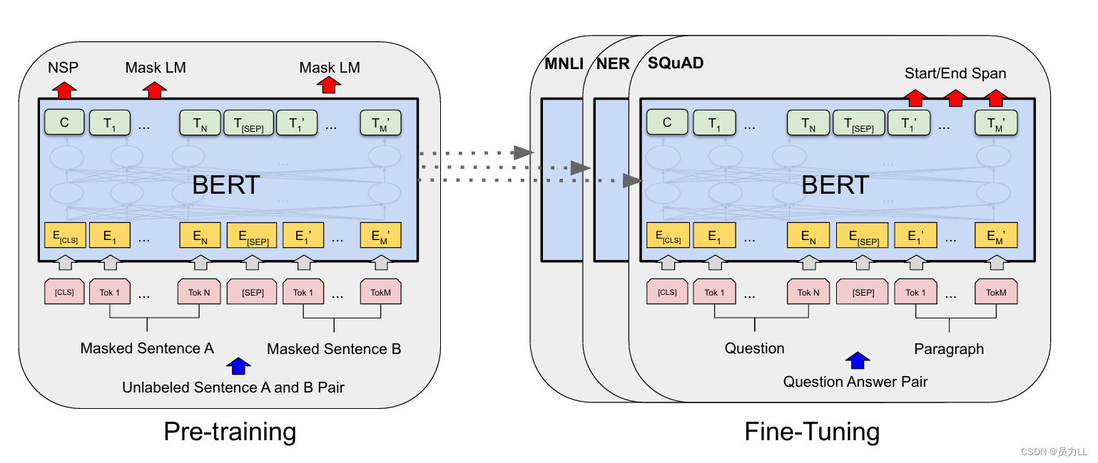 《BERT: Pre-training of Deep Bidirectional Transformers for Language Understanding》论文笔记 1)基于特征的方法:预训练模型用来提取文本的特征表示。2)基于微调的方法:直接在预训练模型的基础上,针对特定下游任务进行额外训练的过程。通过引入了最少的特定于任务的参数,并通过简单的方式对下游任务进行训练重新调整所有预先训练的参数。看这篇论文纯粹是因为我的导师说,去跑下BERT代码,学习理解一下是很有帮助的,那么作为刨根问底的人,当然先把原论文看一遍啦~~~