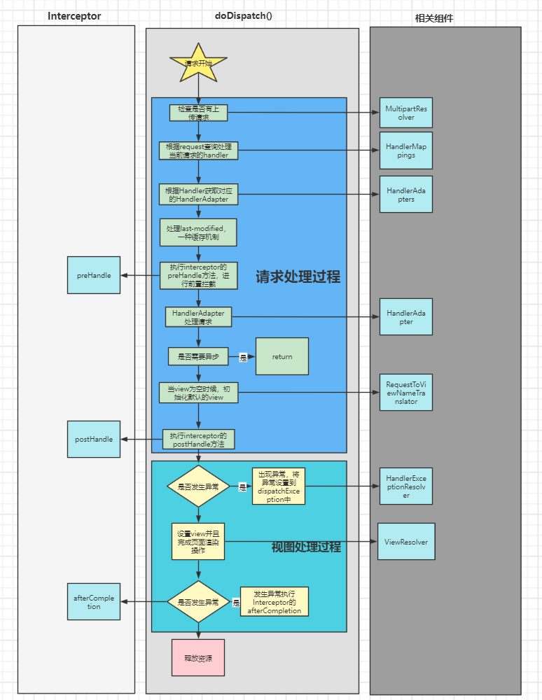 如果在视图处理阶段发生了异常,就会调用拦截器的AfterCompletion方法来对异常进行处理
