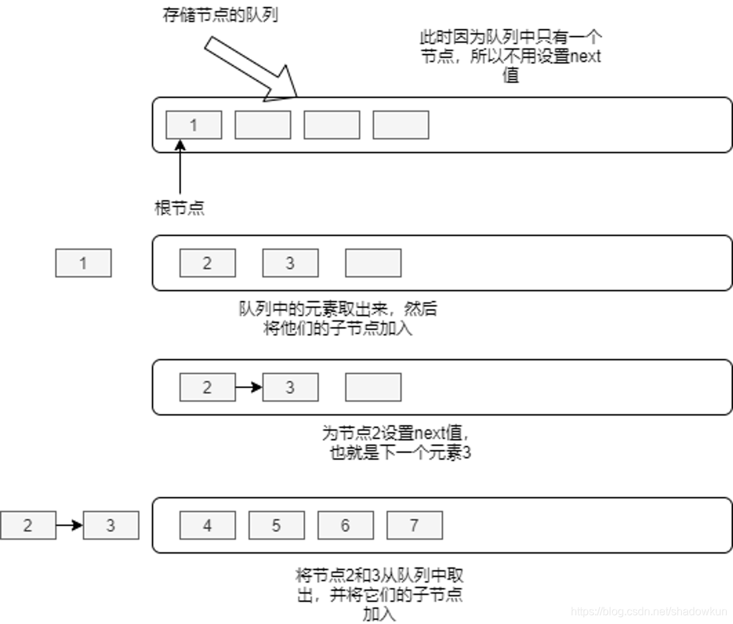将每一层的节点加载到队列中后,按照顺序为每个节点赋值next,比如,队列中第一个节点的next值就是队列中的第二个节点。将一层中的节点都赋值完成后,在将这一层的节点从队列中剔除,并且将他们的子节点加载到队列中。