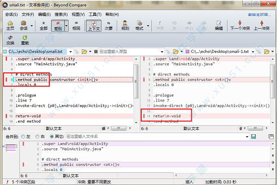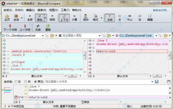 beyond compare 4中文版的合并浏览器支持将一个文件或文件夹的两个不同版本进行变更合并,生成一个输出。这种智能的方式允许在仔细检查冲突的时候能快速接受大部分变更。颜色编码和部分高亮显示允许您简单、快速地接受、拒绝以及合并变更。文件合并时可以使用内置的语法高亮显示编辑器改变输出文件的任意行。
