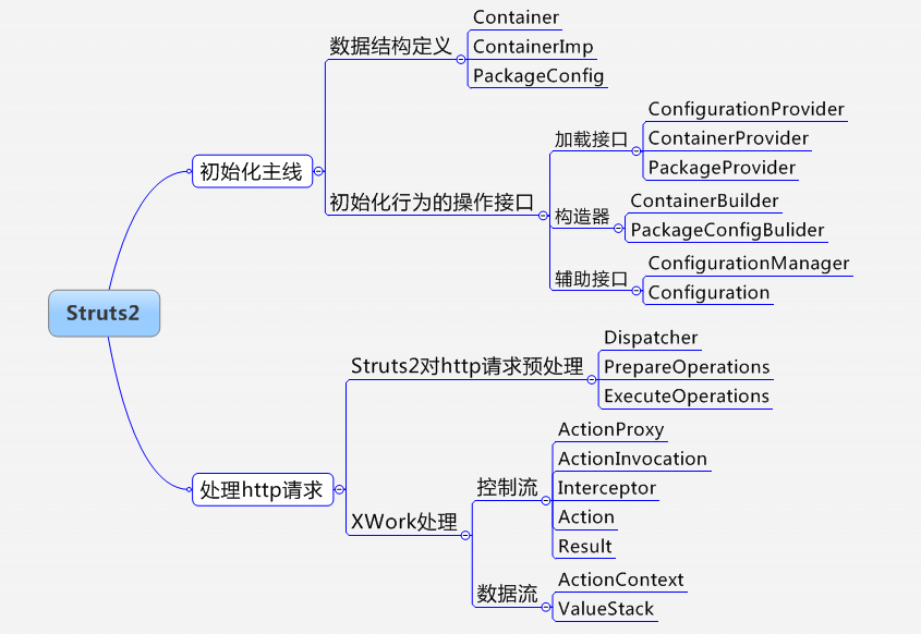 (1)从数据结构定义的角度,Struts2围绕管理Struts2内置对象的容器展开,该容器成为初始化主线中的核心构成元素。而另一类配置元素PackageConfig作为事件请求映射的配置元素也可作为构成元素。接口定义和实现类分别为:Container,ContainerImp,PackageConfig。