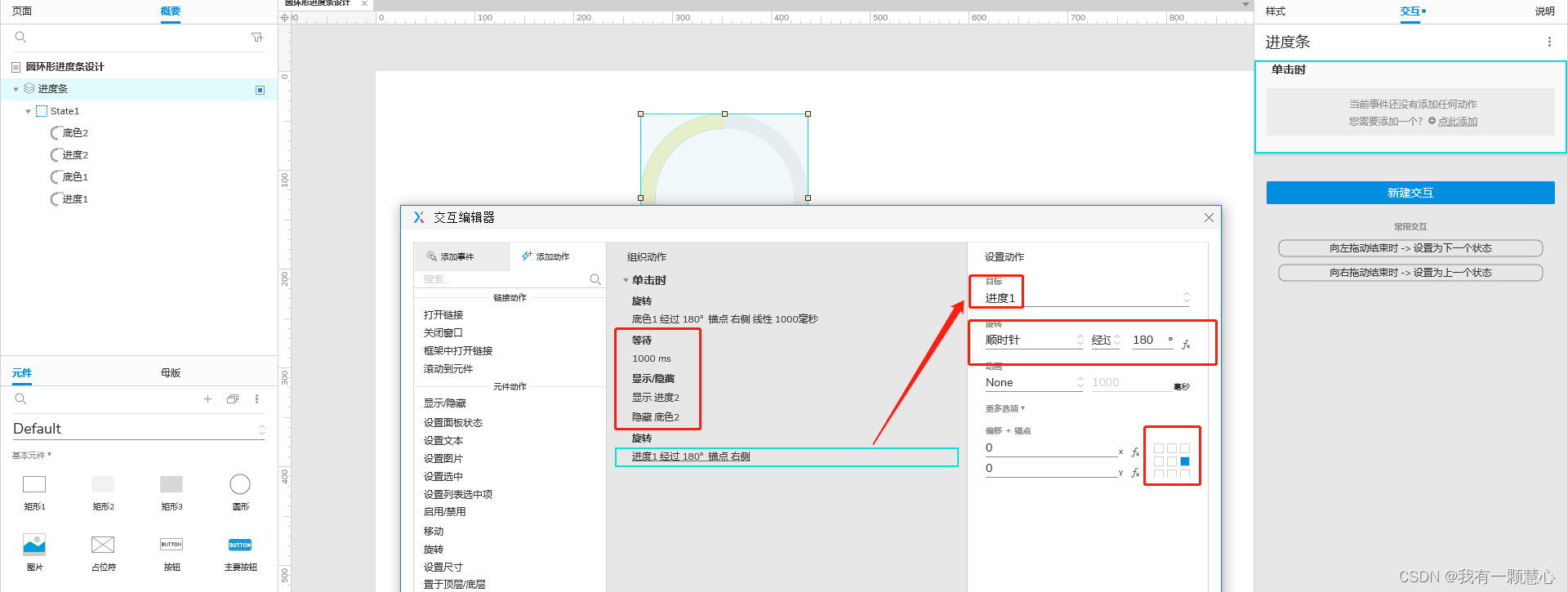 5.2、然后,等待“底色1”旋转结束后,将“进度2”设置为显示,将“底色2”设置为隐藏,