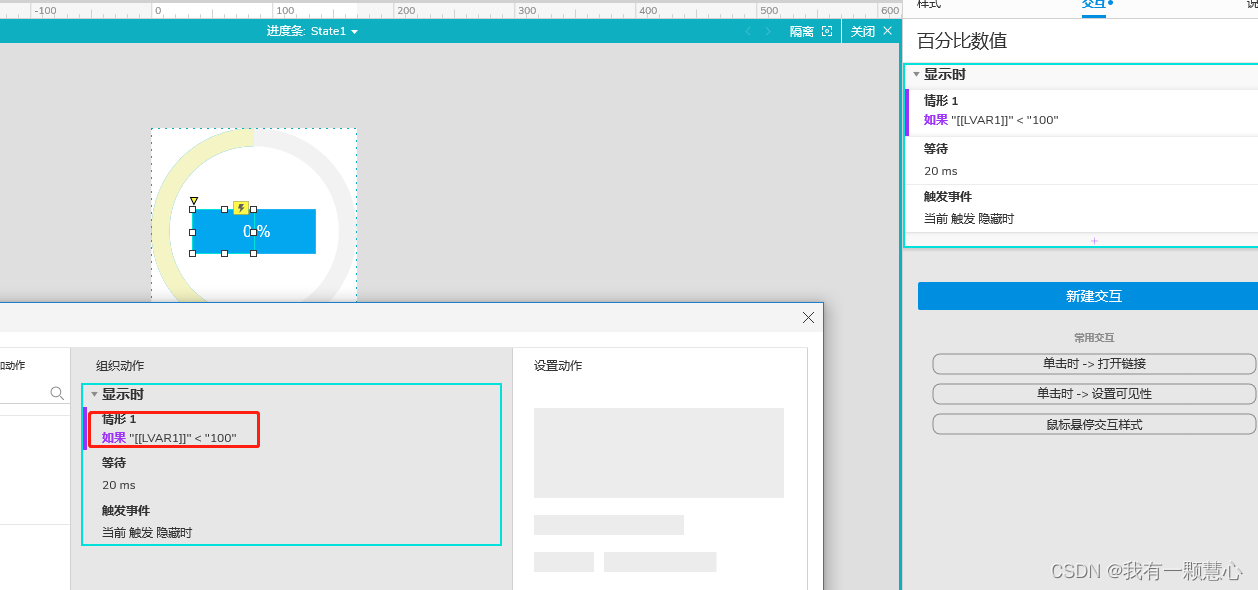 (2)等待20ms后,触发“百分比数值”的隐藏时事件。注,等待的时长,依据“底色1”旋转的时间来计算,“底色1”共旋转了2000ms,2000/100=20ms.