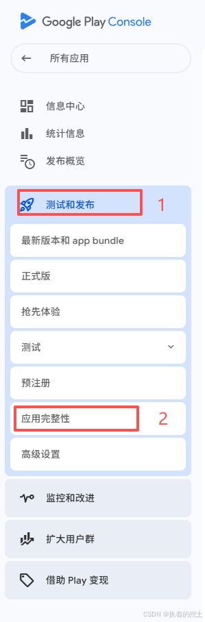 2. 在游戏界面点击左侧测试和发布-应用完整性