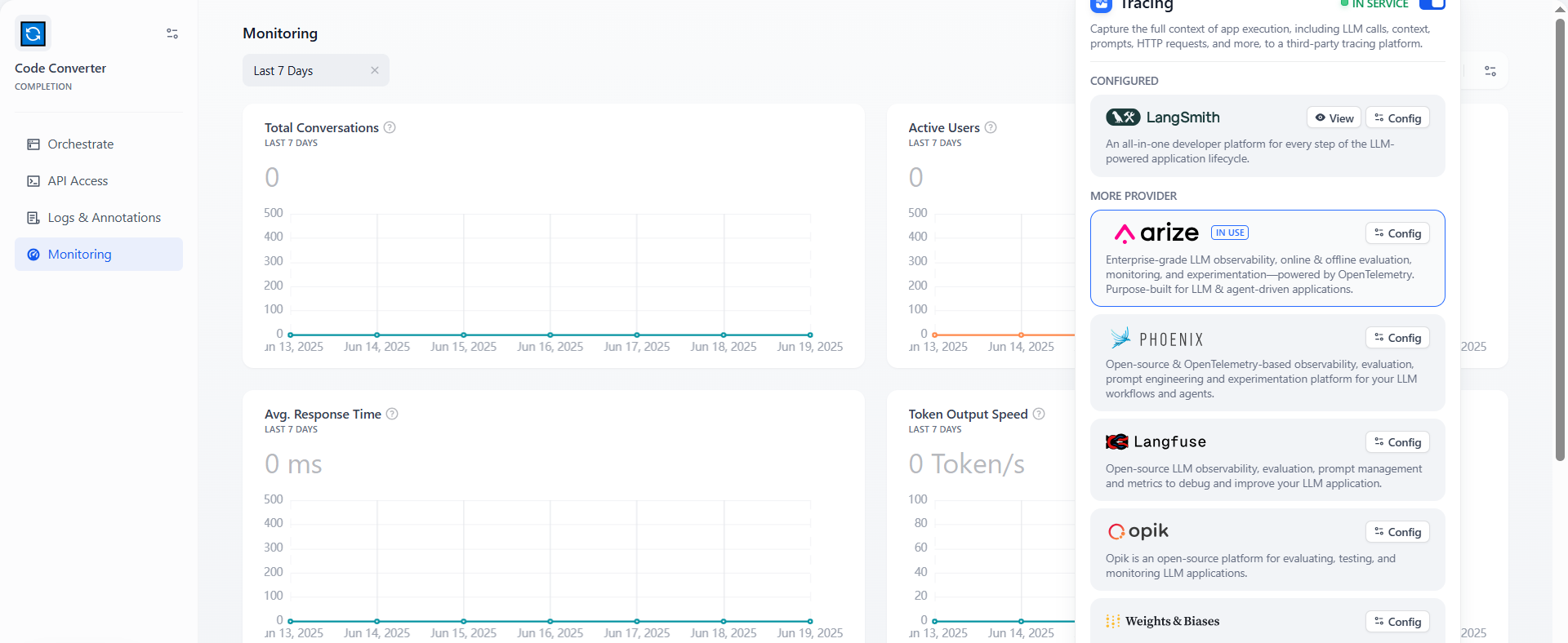 将 Dify 与外部 Ops 工具集成,有助于打破编排应用时可能面临的 LLM “黑盒”问题。开发者只需要在平台上进行简单的配置,即可追踪应用生命周期中的数据和指标,轻松评估在 Dify 上创建的 LLM 应用质量、性能和成本。
