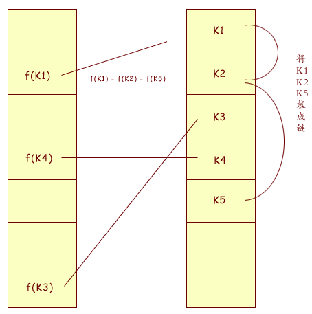 HashMap 的冲突处理方式也区别于 .NET Hashtable 的开放定址法, 为 "链地址法". 当后插入的 K2, K3, K4 等与先插入的 K1 位置冲突时, 在 K1 位置建立一个链表, 把 K2, K3, K4... 另存至链表中, 即一个位置可以对应 "一串" 数据. 搜索 K2, K3, K4 的时候先查找 f(K1) 位置本身, 若不符则顺序遍历链表. 这样处理的好处是不会产生如同 .NET Hashtable 中开放定址法的二次聚集现象 (在探测空位时产生连续冲突).