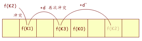 [2] 如果发生多个 K 值的哈希值重复, 即 f(K1) = f(K2), 而 f(K1) 位置已经有数据占用了, Hashtable 采用的是 "开放定址法" 处理冲突, 具体行为是把 HashOf(K2) % Array.Length 改为 (HashOf(K2) + d(K2)) % Array.Length , 得出另外一个位置来存储关键字 K2 所对应的数据, d 是一个增量函数. 如果仍然冲突, 则再次进行增量, 依此循环直到找到一个 Array 中的空位为止. 将来查找 K2 的时候先搜索 HashOf(K2) 一档, 发现不是 K2, 那么增量 d(K2) 继续搜索, 直到找到为止. 连续冲突次数越多, 搜索次数也越多, 效率越低.