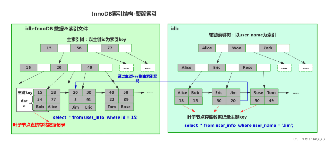 对于 InnoDB ,因为主键索引是聚集索引,所以其叶子节点存储的就是实际的数据。而非主键索引存储的则是主键的值 :