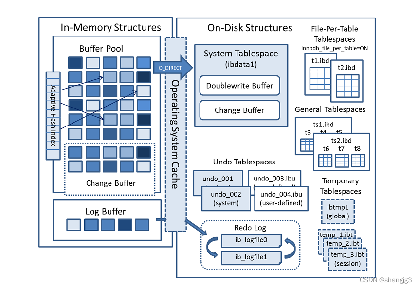 一个 InnoDB 引擎完整的内存结构和磁盘结构如下图所示: