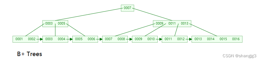 B+ Tree 树的所有非叶子节点 (如 003,007),都会在叶子节点冗余一份,所有叶子节点按照链表的方式进行组织,这样带来的好处是在范围查询中,只需要通过遍历叶子节点就可以获取到所有的索引信息。