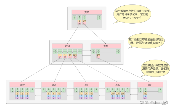 从图中可以看出来,我们新分配了一个编号为30的页来专门存储目录项记录。这里再次强调目录项记录和普通的用户记录的不同点: