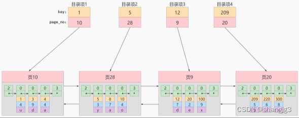 先从目录项中根据二分法快速确定出主键值为20的记录在目录项3中(因为 12 < 20 < 209 ),它对应的页是页9。