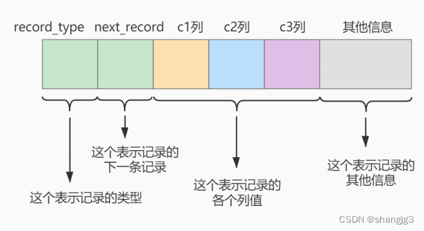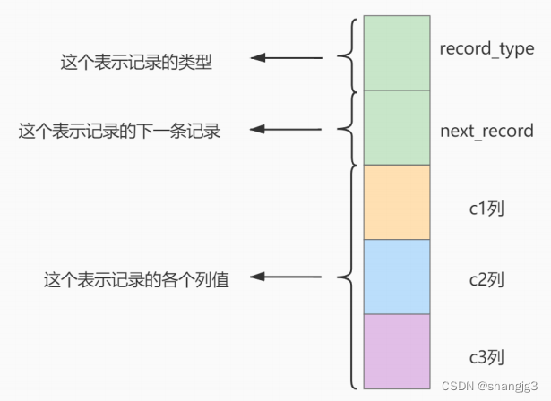 next_record:记录头信息的一项属性,表示下一条地址相对于本条记录的地址偏移量,我们用箭头来表明下一条记录是谁。