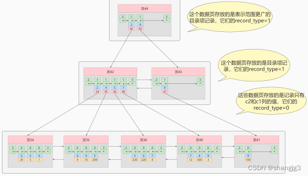 一个B+树的节点其实可以分成好多层,规定最下边的那层,也就是存放我们用户记录的那层为第0层,之后依次往上加。之前我们做了一个非常极端的假设:存放用户记录的页最多存放3条记录,存放目录项记录的页最多存放4条记录。其实真实环境中一个页存放的记录数量是非常大的,假设所有存放用户记录的叶子节点代表的数据页可以存放100条用户记录,所有存放目录项记录的内节点代表的数据页可以存放1000条目录项记录,那么: