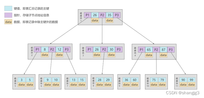 4)假设中间节点节点的关键字为:Key[1], Key[2], …, Key[k-1],且关键字按照升序排序,即 Key[i] <Key[i+1]。此时 k-1 个关键字相当于划分了 k 个范围,也就是对应着 k 个指针,即为:P[1], P[2], …,P[k],其中 P[1] 指向关键字小于 Key[1] 的子树,P[i] 指向关键字属于 (Key[i-1], Key[i]) 的子树,P[k]指向关键字大于 Key[k-1] 的子树。