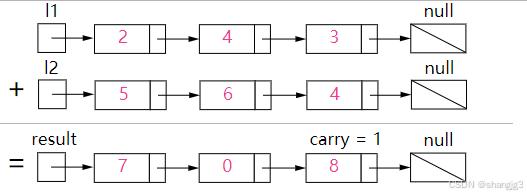 我们首先从最低有效位也就是列表 l1 和 l2 的表头开始相加。注意需要考虑到进位的情况!