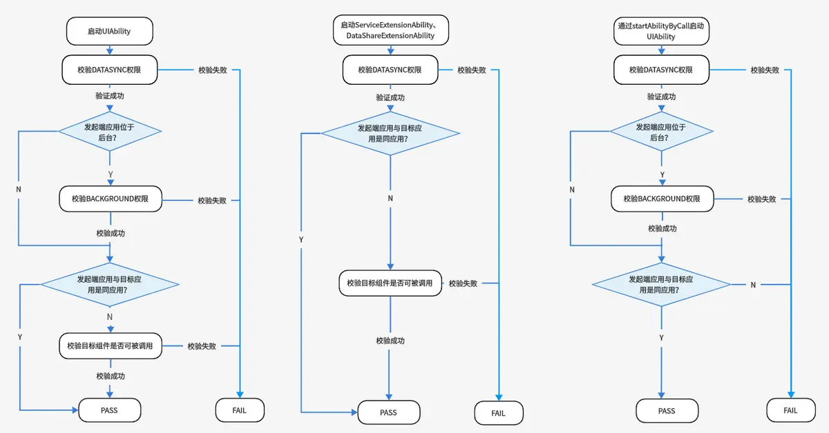 上述组件启动规则自API 9版本开始生效。开发者需熟知组件启动规则,避免业务功能异常。启动组件的具体校验流程见下文。