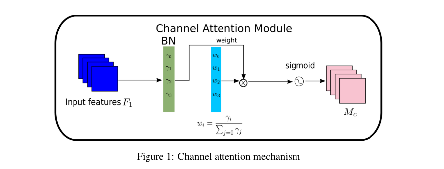 - 通道注意力子模块:使用批量归一化的缩放因子来衡量通道的重要性,通过计算权重来获得输出特征。