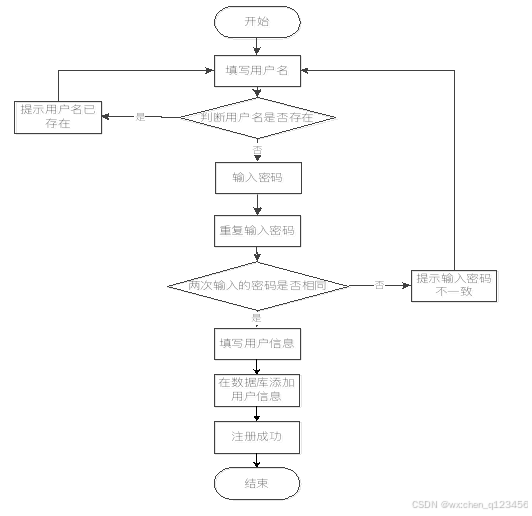用户是一切应用的基础,只要牵扯到用户,那么肯定需要用户进行注册,只有这样才能让注册的用户进行使用。如果用户没有注册,只能算是游客,那么只能访问一些大众用户可以浏览的信息,如果需要用户操作的部分是不允许访问的,这样能极大的保证用户的权利。用户注册流程用下面的图来表示,主要是先判断用户名,只有用户名能用了才可以进行后面的信息注册。