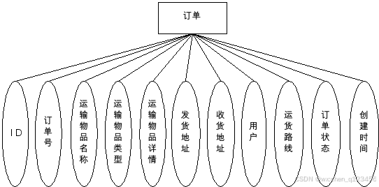(2)订单包括的属性有运输物品名称,发货地址,订单状态等。其属性图如下。