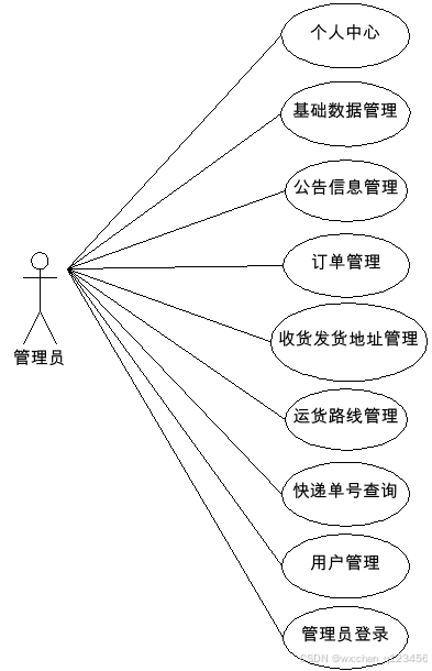管理员对于物流信息管理系统操作的功能包括管理公告,管理收货地址发货地址信息,管理订单,管理快递信息,管理运货路线等功能。其用例图如图3.4所示:
