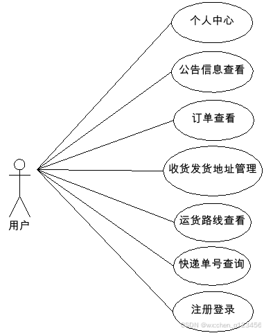 用户对于物流信息管理系统操作的功能包括查询快递,查看订单,查看运货路线,管理收货地址,管理发货地址,查看公告等。其用例图如图3.5所示: