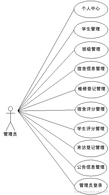 管理员用例图的绘制结果见图3-5。管理员登录进入本系统操作的功能包括管理宿舍信息,管理学生评分信息,管理宿舍评分信息,管理来访登记信息,管理维修登记信息,管理班级与学生信息等。