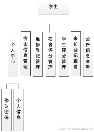 学生功能结构图的绘制结果见图4-2。学生登录进入本系统操作的功能包括查看学生评分,查看宿舍评分信息,查看宿舍信息,登记宿舍维修信息,管理宿舍维修信息,查看公告等。
