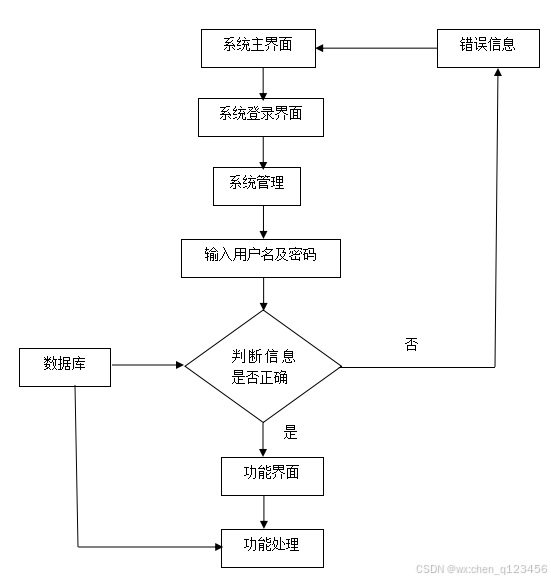 从系统的角色上分析,每个用户角色都代表了不同的账号身份,而不同的身份则代表着功能的异同,所以首先要区分用户的角色身份问题。设置用户登录需要输入账号和密码,输入的信息必须与数据库里已经存在的账号密码信息进行比对,只有正确的账号和密码才可以进行下一步的页面显示操作,如果不正确的账号密码,则拒绝用户登录,也代表着用户没有继续访问的权限,系统是无法继续提供服务的。
