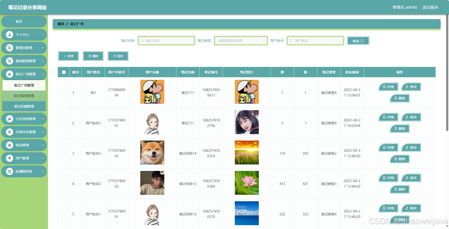 - 笔记广场管理:管理员可以管理笔记广场的内容,包括审核、删除违规内容等操作。