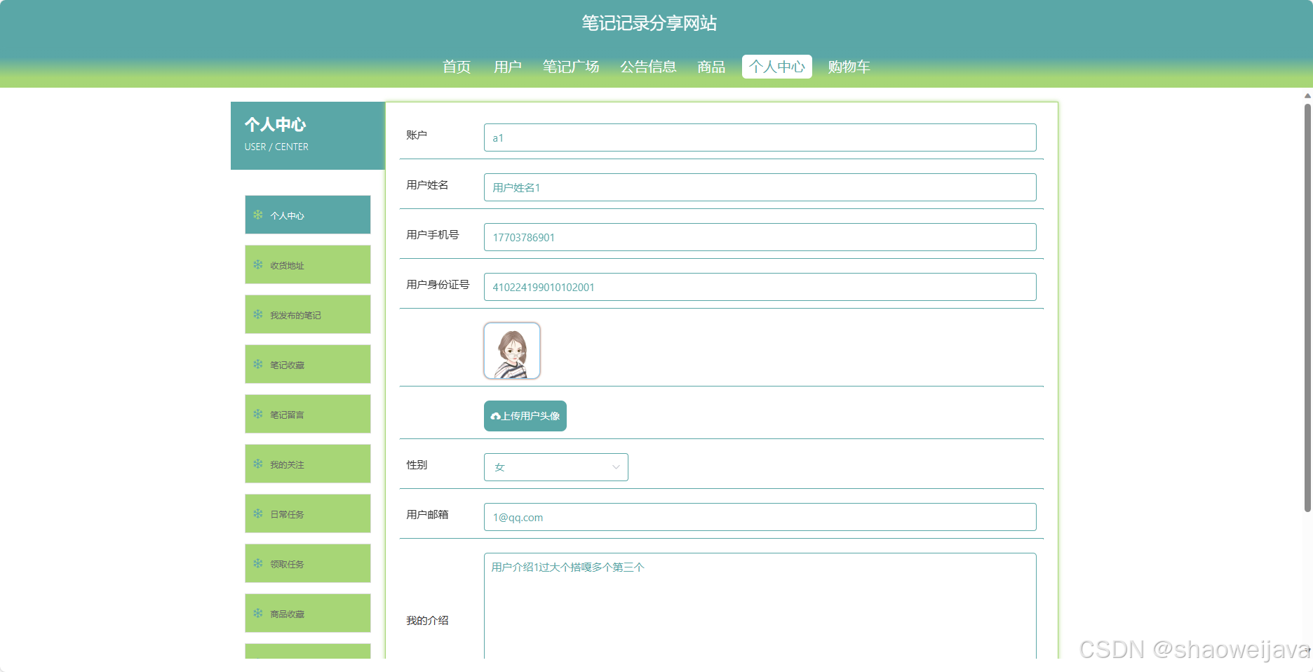 - 个人中心:用户可以管理个人信息、查看自己的笔记记录等。