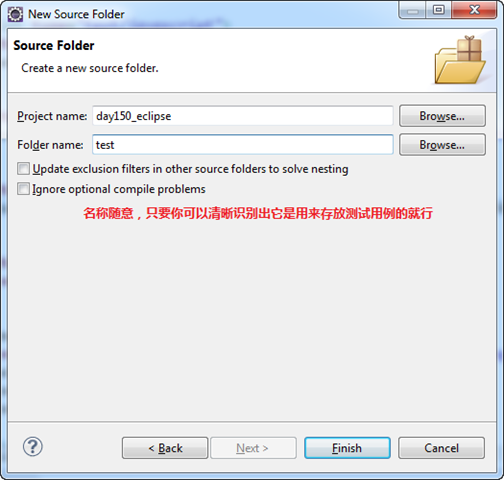 很多人在编写测试用例的时候喜欢用一个main方法在被测试程序内部中进行测试,如此把测试代码和生产代码混合在一起对程序可读性简直是毁灭性的打击,所以还是建立一个专门的测试类吧,测试类的命名最好遵从一定的规范这样大家都容易识别,建议将被测试类名+Test作为基本测试类的命名规则。关于测试类的存放又是有门道的,很多人喜欢在src下建立一个package叫做test,然后在这里面存放所有的测试用例。还是那句话,测试类不应该出现在生产环境下,所以还是将测试类放到一个单独的source folder下面吧。