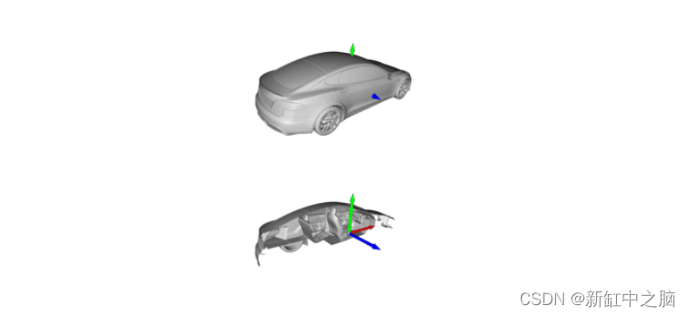 现在让我们创建一个 XYZ 坐标系来了解该汽车模型在欧几里德空间中的方向。 XYZ 坐标系可以叠加在上面的 3D 网格上,并通过运行以下代码行进行可视化: