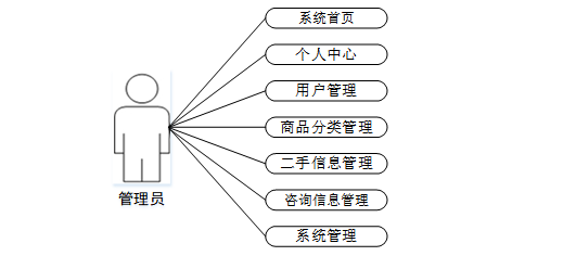管理员登入使用本系统涉到的功能主要有系统首页、个人中心、用户管理、商品分类管理、二手信息管理、咨询信息管理、系统管理等功能。管理员用例如图3-1所示。