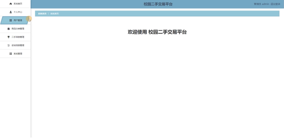 管理员进入主页面,主要功能包括对系统首页、个人中心、用户管理、商品分类管理、二手信息管理、咨询信息管理、系统管理等进行操作。管理员主界面如图5-7所示: