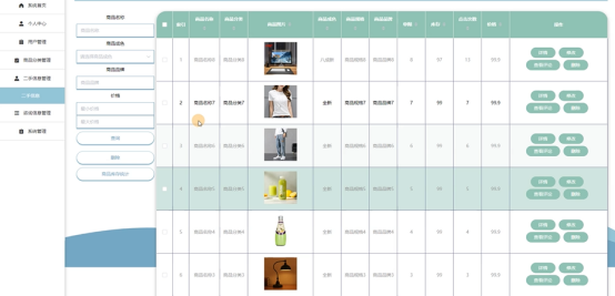 管理员点击二手信息管理。在二手信息页面输入商品名称、商品颜色、商品品牌和价格进行查询二手信息列表,并根据需要对二手信息详情信息进行详情、修改、删除或查看评论操作;如图5-10所示: