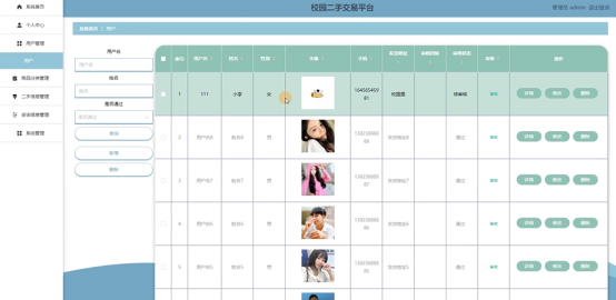管理员点击用户管理。在用户页面输入用户名、姓名和选择是否通过进行查询、新增或删除用户列表,并根据需要对用户详情信息进行详情、修改或删除操作;如图5-8所示: