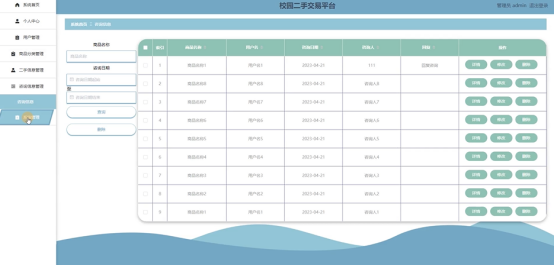后台管理:管理员可对用户信息、商品分类、二手信息、咨询信息等进行管理,确保平台的正常运营。