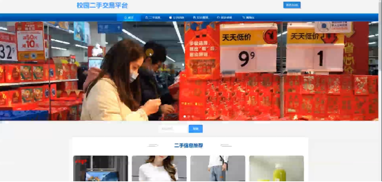 当人们打开系统的网址后,首先看到的就是首页界面。在这里,人们能够看到校园二手交易平台的导航条和二手信息推荐等。系统首页界面如图5-1所示: