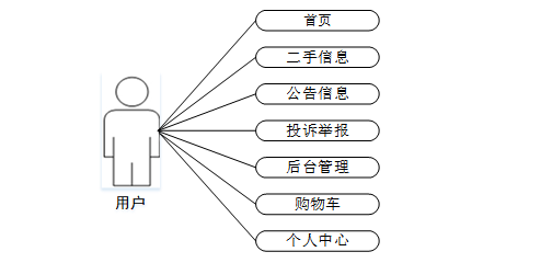 用户登入使用本系统涉到的功能主要有首页、二手信息、公告信息、投诉举报、后台管理、购物车、个人中心等功能。用户用例如图3-2所示。