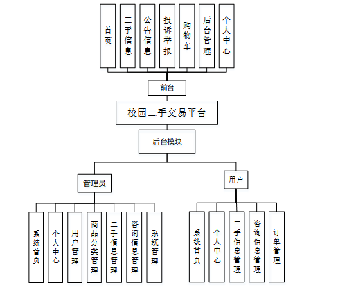 后台主要功能是:系统首页、个人中心、用户管理、商品分类管理、二手信息管理、咨询信息管理、系统管理等功能。系统总体功能结构图如图4-1所示。
