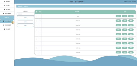 管理员点击商品分类管理。在商品分类页面输入商品分类进行查询、新增或删除商品分类列表,并根据需要对商品分类详情信息进行详情、修改或删除操作;如图5-9所示: