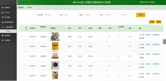 管理员点击二手图书管理,在二手图书管理页面中对图书名称、图书类型、图书图片、简述、作者、出版社、单限、库存、点击次数、价格等信息,进行查询、新增或删除二手图书等操作。如图5-11所示: