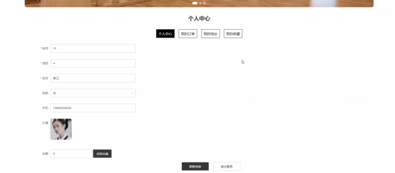 在个人中心页面可以更新个人详细信息,还可以对我的订单、我的地址和我的收藏进行详细操作,如图5-6所示: