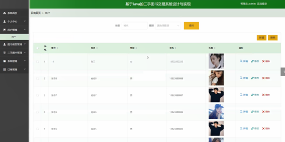 管理员点击用户管理,在用户管理页面中输入账号、姓名、性别、手机、头像等信息,进行查询、新增或删除用户信息等操作。如图5-9所示: